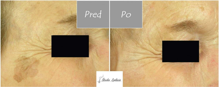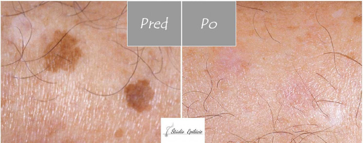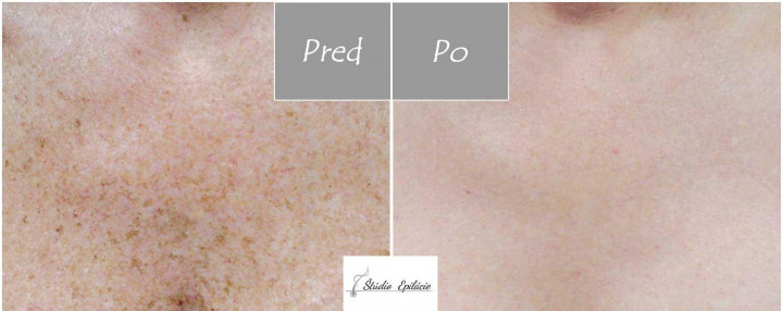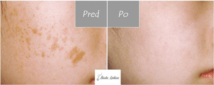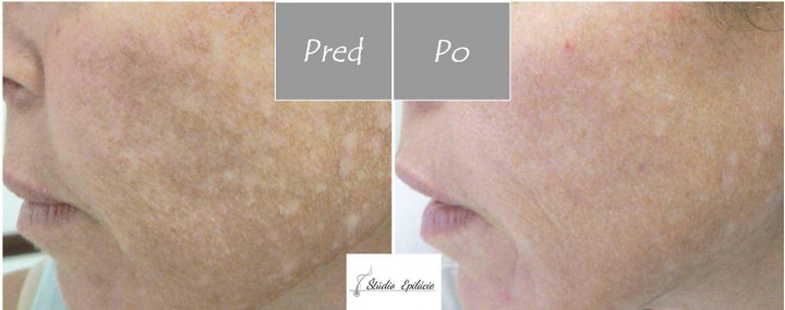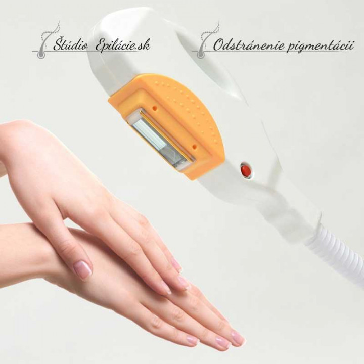 Odstránenie pigmentových škvŕn (hlavne na tvári, dekolte a rukách) je založené na selektívnej absorpcii žiarenia kožným tkanivom obsahujúcimi zvýšené množstvo farbiva. Teplota je zvýšená natoľko vysoko, že nastupuje zničenie tmavšie zafarbených bunkových scien. Molekuly melanínu sú eliminované imunitným systémom. Efekt je výrazný po viacnásobnom zákroku.